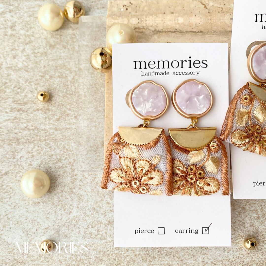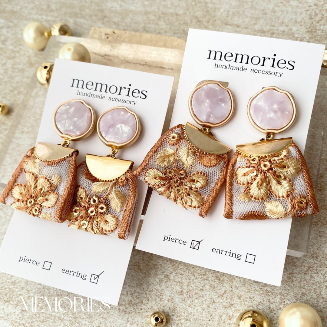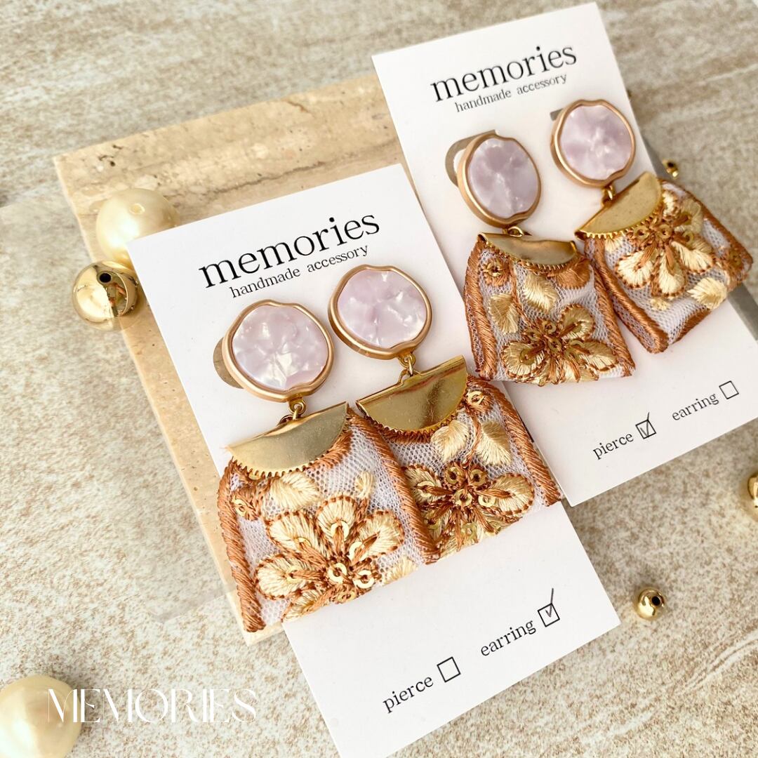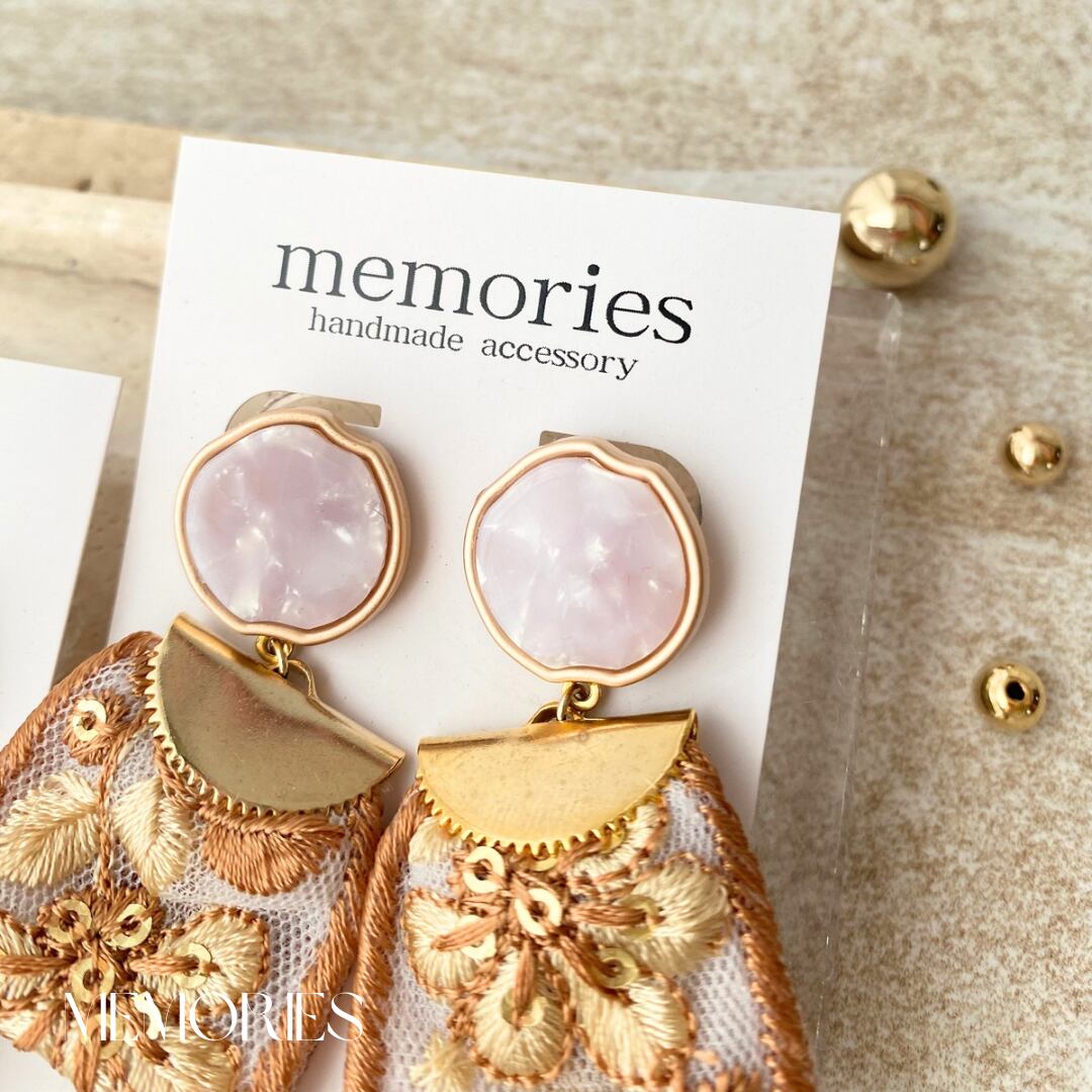 ピンクゴールド大理石風ボタンにブラウンカラーのお花柄インド刺繍リボンを合わせたボタンピアス.