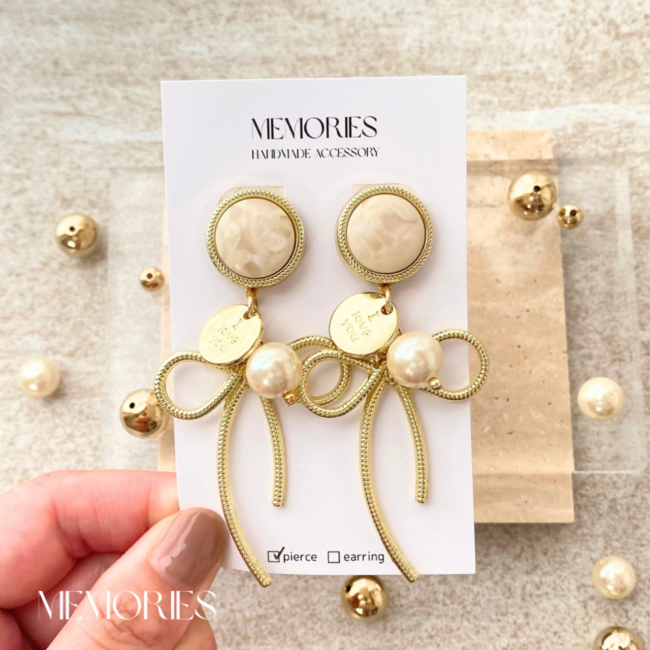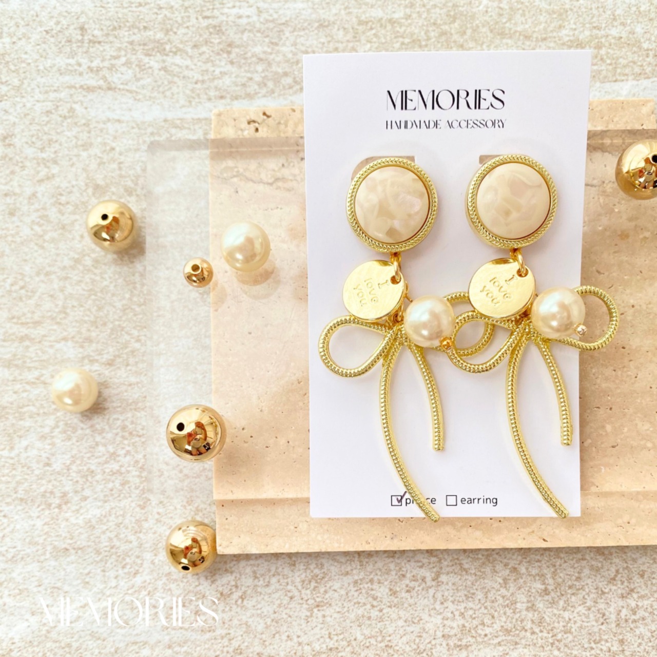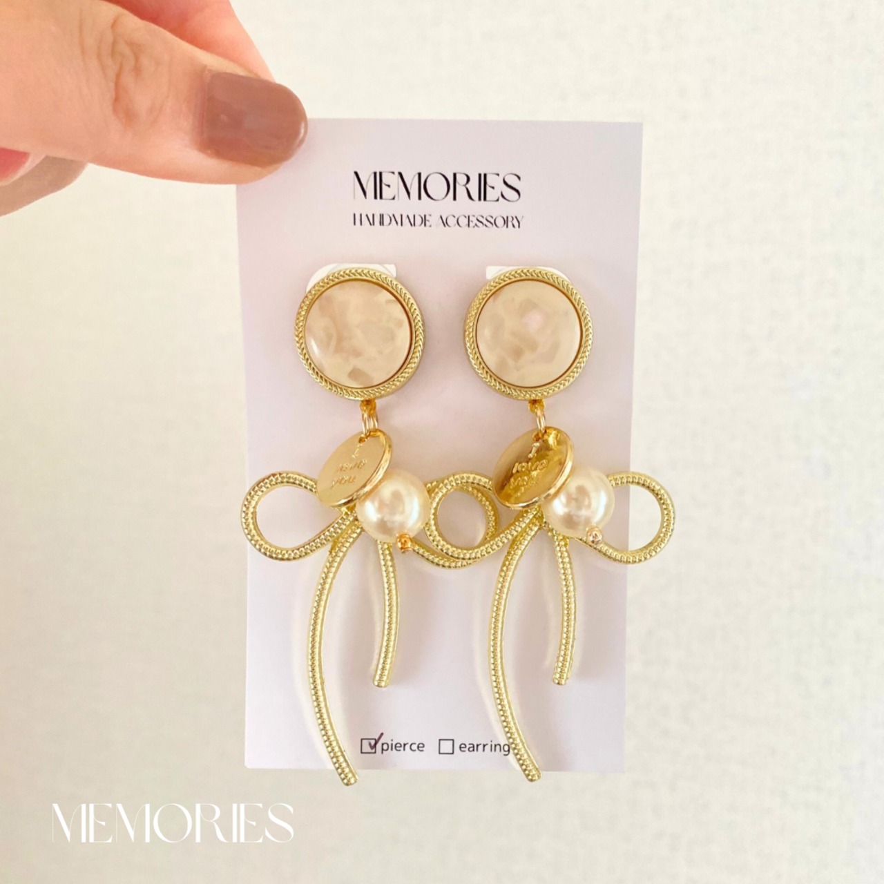 クリームカラーのボタンに大ぶりのリボンチャームと優しい色のパールとチップをつけた豪華なイヤリング♡