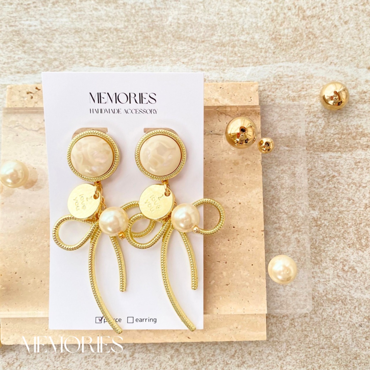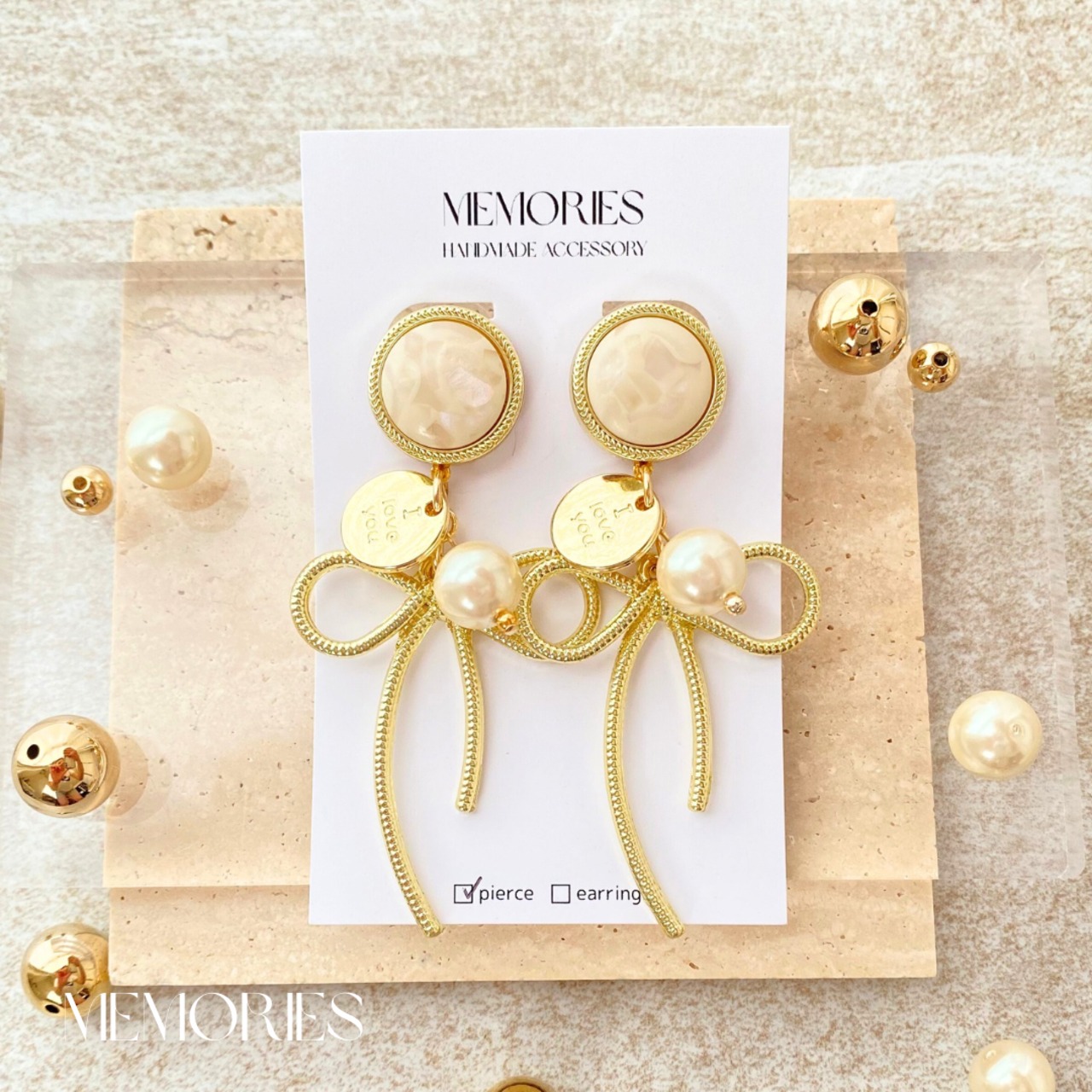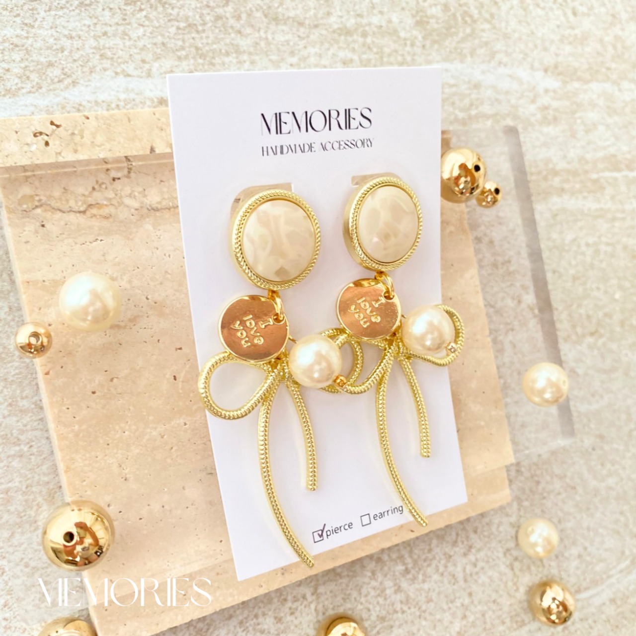 クリームカラーのボタンに大ぶりのリボンチャームと優しい色のパールとチップをつけた豪華なイヤリング♡