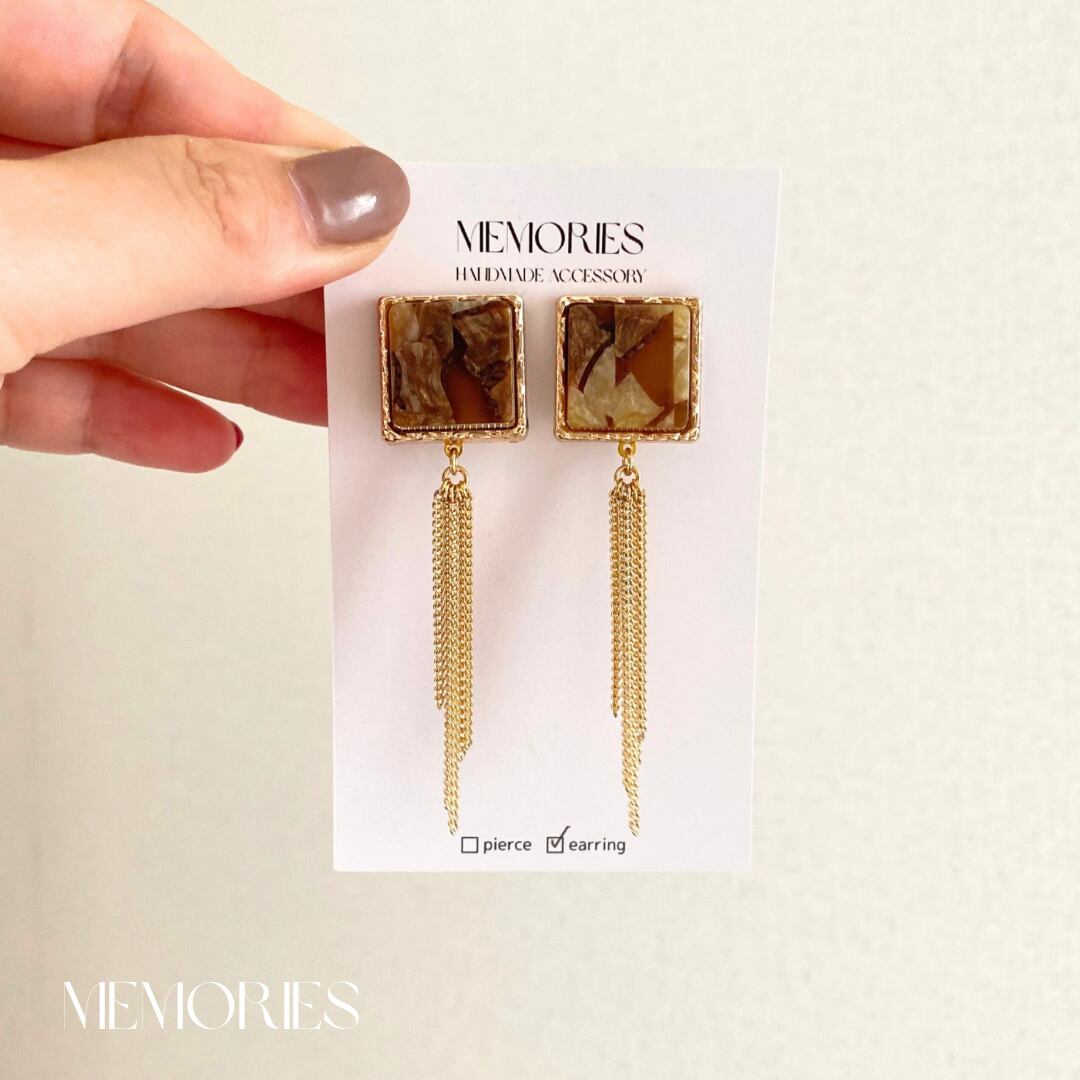 〔イヤリング〕ブラウンボタン×チェーンフリンジのイヤリング