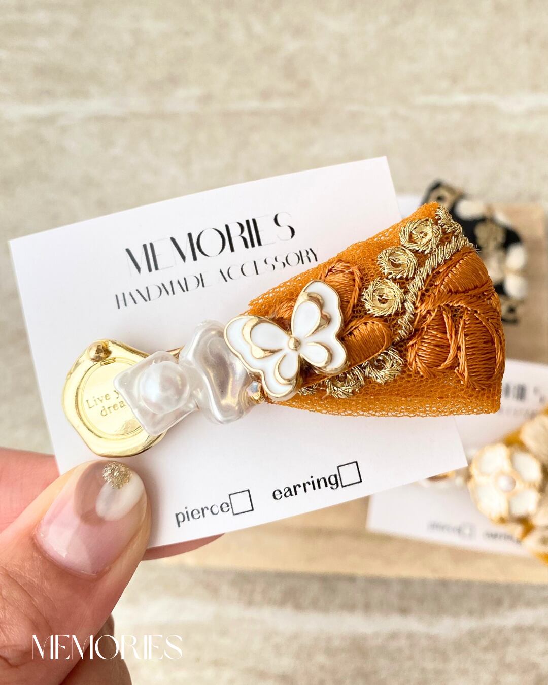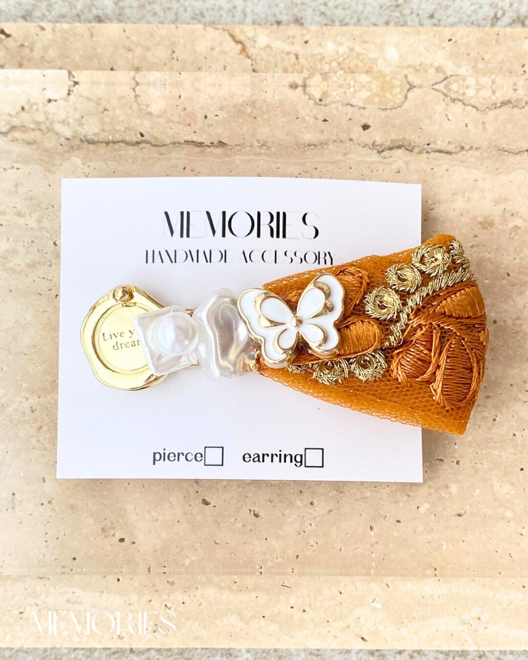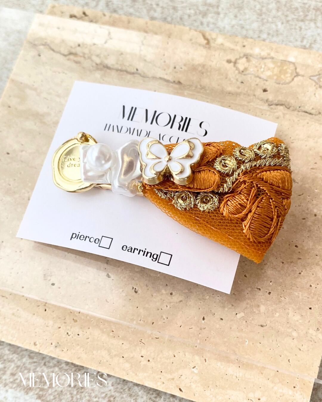 オレンジインド刺繍リボン×蝶々ボタンを使用した豪華なヘアピンが完成しました♡