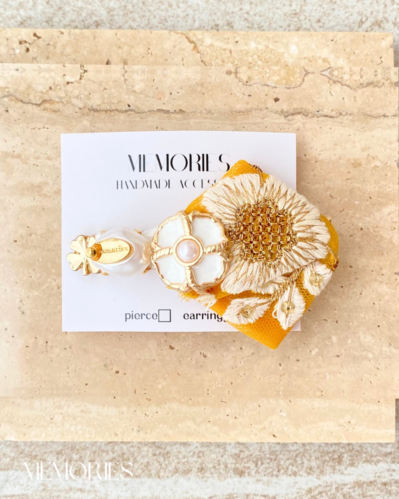 イエローインド刺繍リボン×パールのお花ボタンを使用した豪華なヘアピンが完成しました♡