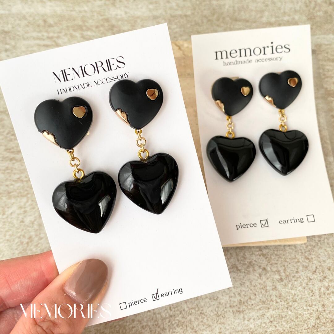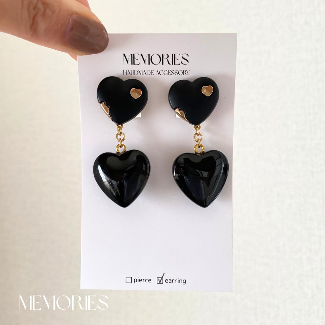 マットブラックのハートボタンにつるんつるんのガラスハートビーズのピアス.