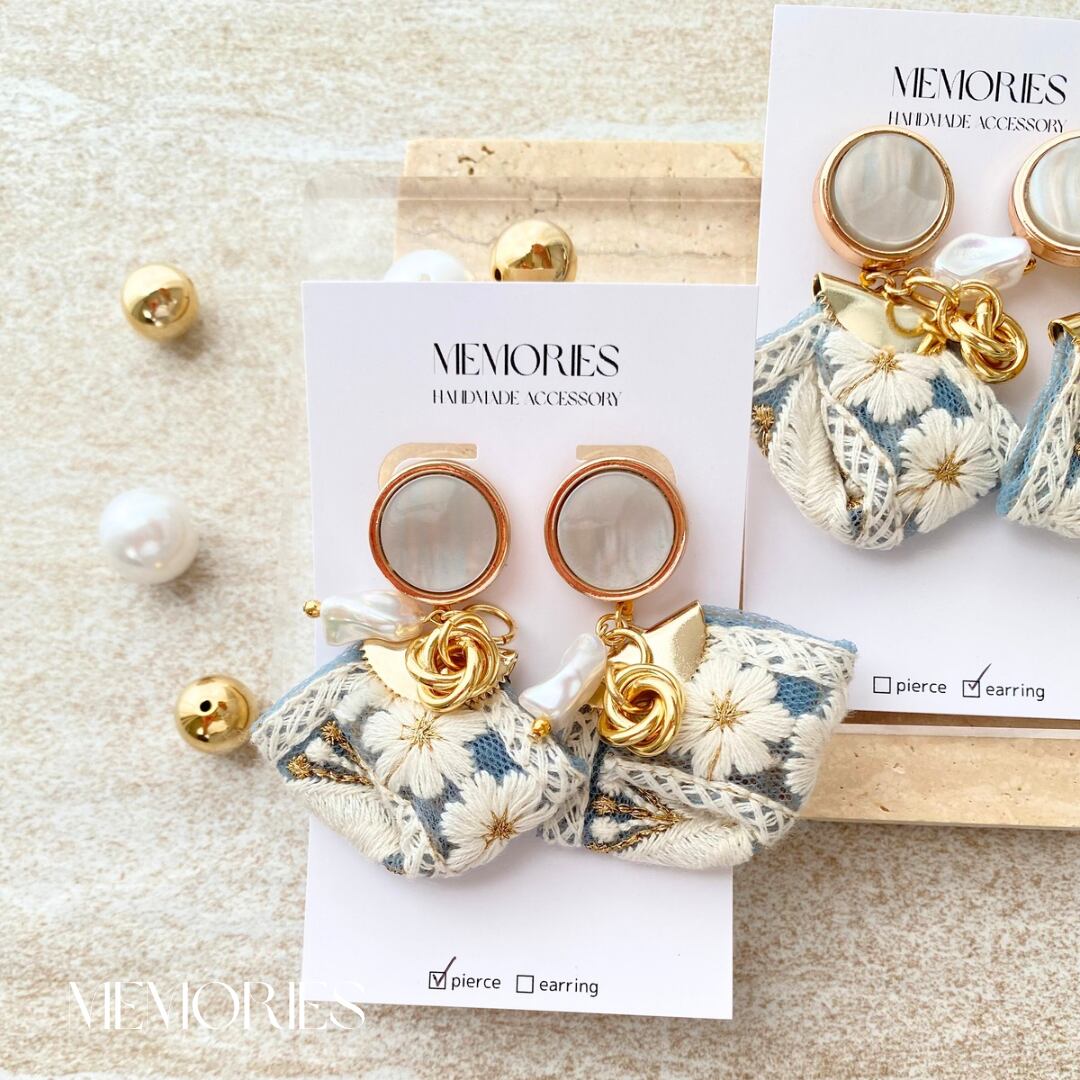 〔イヤリング〕インド刺繍リボン×ちゅるんとボタンのイヤリング