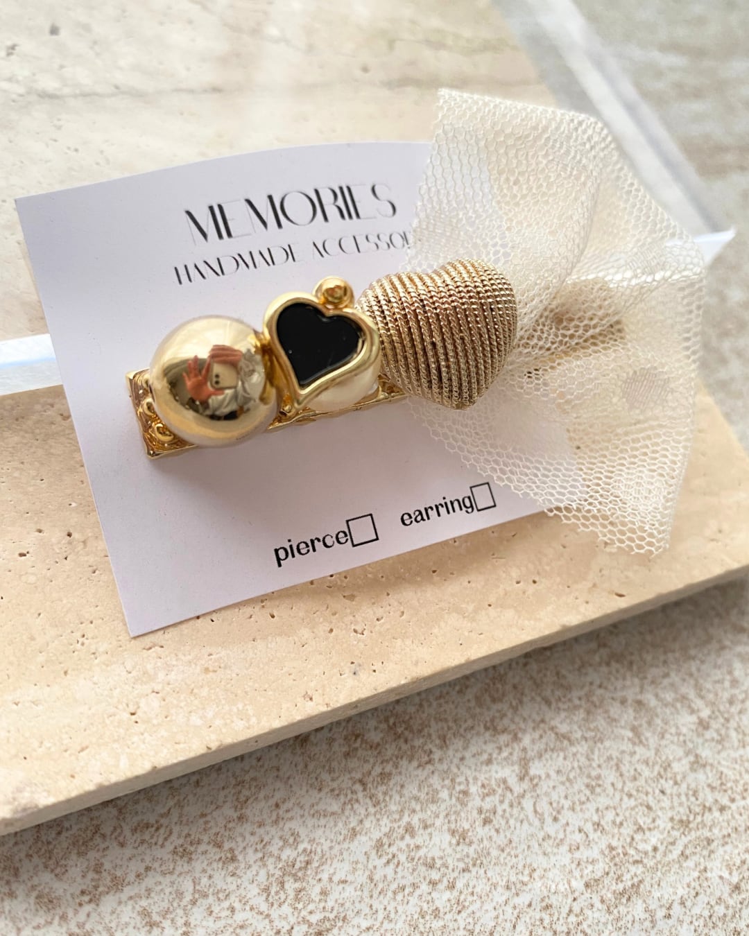 〔ヘアピン〕ハートボタン×クリームドットリボン