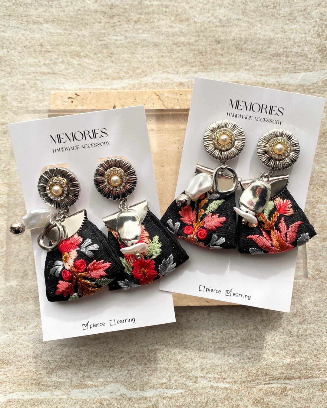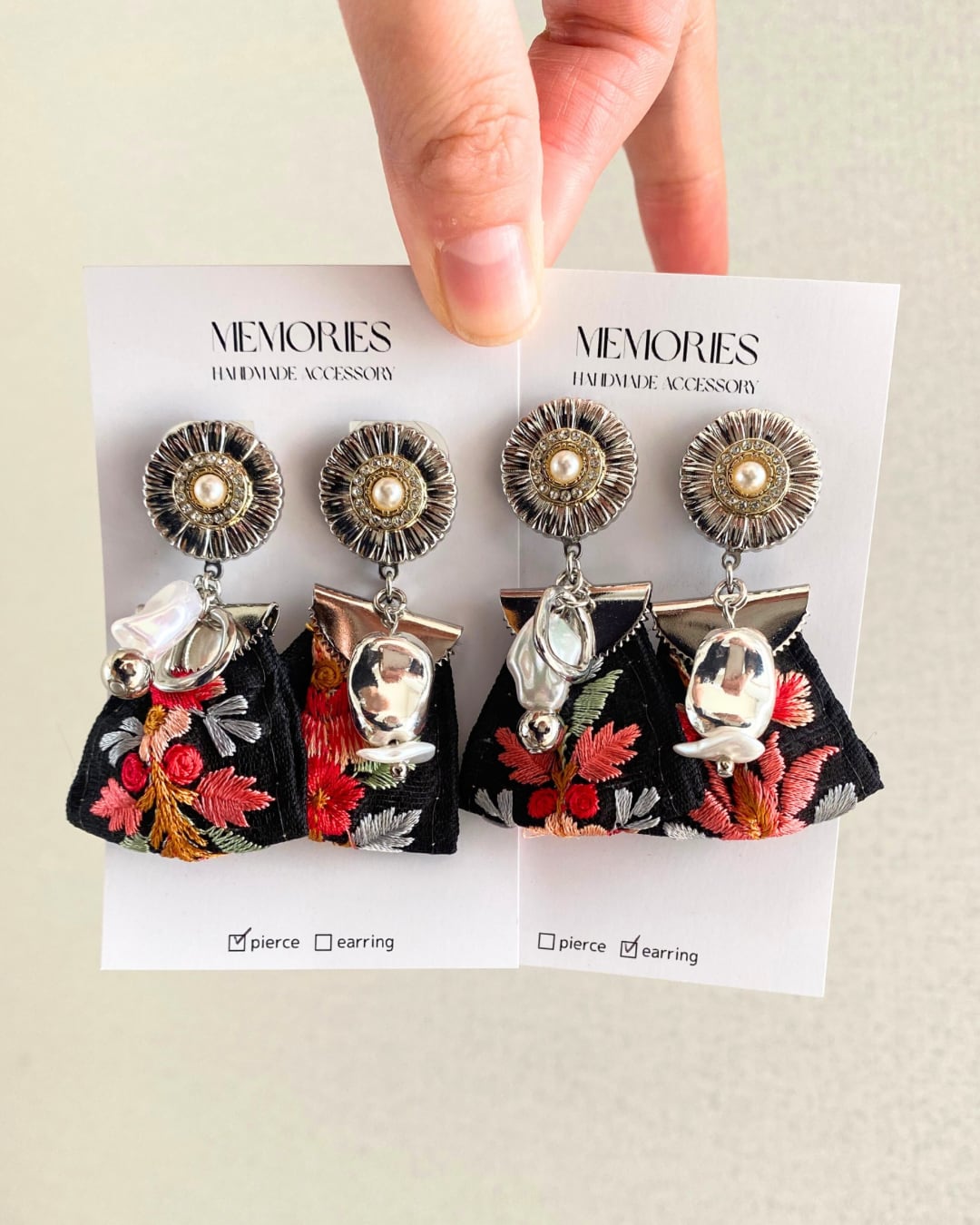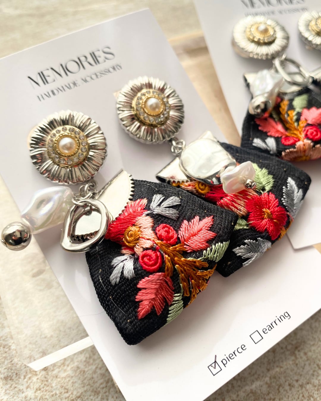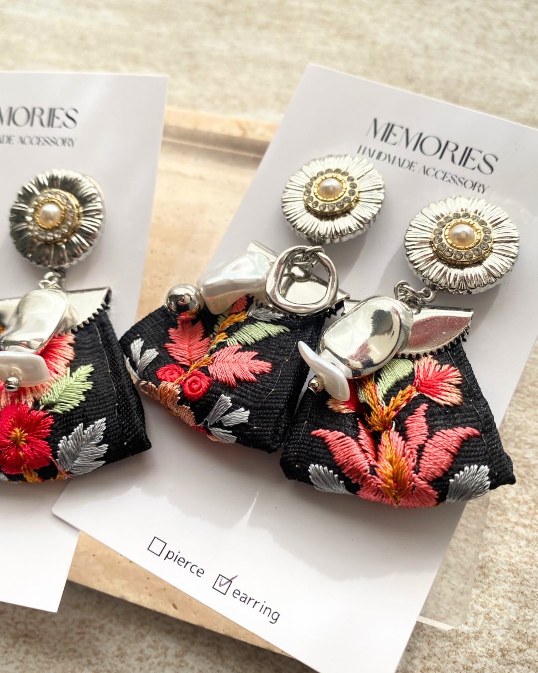 お花のボタン×インド刺繍リボンのピアス♡